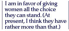 Now, I am in favor of giving women all the choice they can stand. (At present, I think they have rather more than that.) But a careful analysis will reveal that the term has distinct and partly contradictory senses that may not be equally applicable in all contexts. Choice is not a single thing that can be expanded indefinitely at no cost, and a specious appearance of more of it in one area can be shown to entail reducing one's possibilities in another.