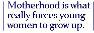 Motherhood is what really forces young women to grow up; I have heard women themselves remark upon this. Scatterbrained dopes whose biggest concern used to be which new hairstyle to try next find themselves keeping accurate financial records and planning their actions, suddenly aware that they have a genuinely important task to perform and surprised to find themselves equal to it.
