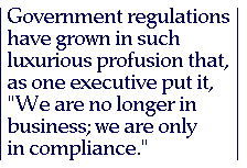 Government regulations have grown in such luxurious profusion that, as one executive put it, "We are no longer in business; we are only in compliance." Women are better suited than men to fastidious compliance with bureaucratic directives and regulatory minutiæ. They are usually untroubled by the enforced niceness of Political Correctness, such as governmental sanctions against anyone who forgets to call cripples "the differently abled."