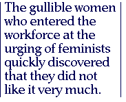 The gullible women who entered the workforce at the urging of feminists quickly discovered that they did not like it very much (despite their feminine advantages enumerated above). Work turned out to be ... well, a lot of work. Their response to the broken promises of feminism, however, was not to blame the ideologues for having made them or themselves for having believed them; it was to blame men. Men simply had to re-engineer the world of work until women found it "fulfilling." And feminism would lead the way again. (One of the movement's greatest strengths has been this ability to profit politically from its own failures.)