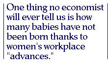 Another consideration that must temper our enthusiasm for these "advances" is the tax increases we have, not coincidentally, suffered during the same period. Shrewd observers have long understood the natural alliance between feminists wanting to nudge or compel women into the workplace and rapacious government wanting to tax their earnings. It is another instance of the common symbiosis between self-indulgence and despotism, the divide-and-rule principle applied to the family.