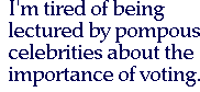 Put simply, I'm tired of being lectured by pompous celebrities about the importance of voting. I'm sick of slick, hip, youth-oriented MTV "Rock the Vote, Choose or Lose" campaigns, telling stupid and impressionable people that it's their civic duty to report to their precinct on Election Day, regardless of what they know and don't know about politics or anything else.