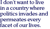 I don't want to live in a country where politics invades and permeates every facet of our lives. I know it causes others to shake their heads in dismay, but I for one feel encouraged when I see "man on the street" interviews in which people are not able to identify, for example, the vice president of the United States. It restores my hope that, in spite of the best efforts of today's sinister would-be totalitarians, who want to insert the state into every nook and cranny of normal family life, the personal has most decidedly not become the political. Instead, to the dismay of today's elites, the personal remains largely personal.