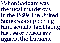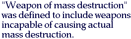 It is significant that "weapon of mass destruction" was defined to include weapons incapable of causing actual mass destruction: the moniker was applied to all chemical and biological weapons as well as nuclear weapons. Thus, the mustard gas that Saddam used in the Iraq/Iran War of the 1980s was fitted into that category. But it was a battlefield weapon just like the poison gas used during World War I. Inhumane as the weapon was, it had never previously been regarded as in any way comparable in destructiveness to nuclear weapons. Therefore, it was quite possible that Saddam possessed weapons that were inhumane, and banned by international agreements, including the 1991 UN Resolution ending the first Gulf War, but that did not threaten masses of civilians and certainly posed no imminent danger to Americans. As Robin Cook, who resigned as foreign secretary [see correction] from Tony Blair's cabinet over the war issue, puts it: "We need to rescue the meaning of words from becoming a further casualty of the Iraqi War. A weapon of mass destruction in normal speech is a device capable of being delivered over a long distance and exterminating a strategic target such as a capital city. Saddam had neither a long-range missile system nor a warhead capable of mass destruction." [3]