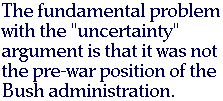Since physical evidence of WMDs has not been found, some Bush administration apologists have attempted to deny that such claims were ever made. For example, the conservative Christopher Ruddy, best known for his conspiratorial views of Bill Clinton, writes: "The war was not fought because we knew for sure that Saddam Hussein had nuclear, chemical, or biological weapons. The war took place precisely because we did not know for sure what this maniac was up to." [4] But a simple, straightforward reading of the Bush administration's pre-war speeches clearly shows otherwise.
