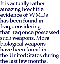 It is actually rather amazing how little evidence of WMDs has been found in Iraq, considering that Iraq once possessed such weapons. By way of comparison, more biological weapons have been discovered in the United States during the last few months, although Washington officially abandoned its biological weapons program in 1969. In May 2003, bioweapons including anthrax and other dangerous bacteria were unearthed near Ft. Detrick, a bio-defense center in Maryland, about 50 miles from Washington, D.C. Had such a find been made in Iraq it undoubtedly would have been touted as physical evidence of Iraq's WMDs, especially since there is no documentation of Ft. Detrick's disposal of biological weapons; a comparable failure of documentation on Iraq's part fueled American claims that the Iraqi weapons must still exist. [86]