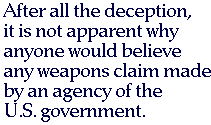 After all the frenzied, kaleidoscopic, crack-brained deception, it is not apparent why anyone would believe any weapons claim made by an agency of the U.S. government. If claims are to be substantiated, it would now seem imperative to admit outside inspectors to evaluate any WMD evidence. It is the height of irony that administration officials complained to high heaven that Saddam was not providing full access to the UN weapons inspectors and then, after the United States had occupied Iraq, kept the inspectors out of the country entirely.