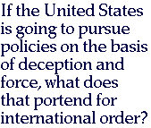Moreover, if the United States is going to pursue policies on the basis of deception and force, what does that portend for international order? Throughout the 20th century, Washington publicly promoted peace and stability in the world through international law. In fact, world stability has been seen as central to the global economic interdependence that is the key to American prosperity. Undoubtedly, there has been an element of utopianism in that thinking, and in actual practice the United States has violated those rules, but it can be argued and it certainly used to be argued at wearying length by Establishment soft-interventionist types that the framework of international rules and standards promoted by the United States did serve to restrict global armed conflict.
