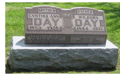 | Wilborn Day (18441937) is buried with his wife, Cynthia, in Woodlawn Cemetery in Warren, Indiana (Huntington County). At least two of his daughters and both of his sons went on to become teachers, and one of them (my great-grandfather) a superintendent of schools in Grant County, Indiana.