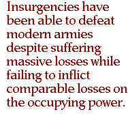 All of that should make people very skeptical of Mr. Hitchens's claim that the Iraqi insurgency has fallen into a militarily impossible situation. Insurgencies have demonstrated their ability to defeat modern armies despite suffering massive losses while failing to inflict comparable losses on the occupying power, and many of the trend lines in Iraq are heading in the wrong direction. It appears that a conclusion opposite to that of Mr. Hitchens is warranted.