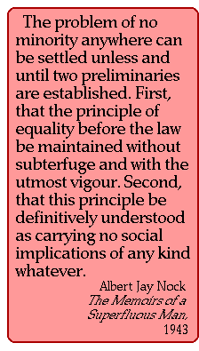 Lest anyone detect an insufficiency of plain speaking here, let me divulge how one of my personal rules of thumb works in practice. I have as little as possible to do with strange Negroes that is, Negroes whose departure from the least constructive traits of their race has yet to be demonstrated to me. [10] I freely admit it. There have to be millions of liberals out there, swirling their martinis at suburban cocktail parties and murmuring comfortable bromides, who privately observe the same rule but won't admit it. Actually, many do admit it, and not only by where they choose to live and send their children to school. Nowadays the bromides at those cocktail parties are often punctuated by caustic racial jokes that 20 years ago would have gotten one read right out of liberaldom.