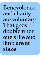 As any individualist knows, on the street we never encounter "groups" or "races" as a physical entity; we encounter only individuals. Let us consider the proverbial "racist cab driver" who will not accept male Negro youths as fares. It is easy for academics in leafy college towns and journalists in their security-barricaded newsrooms and studios to denounce such cabbies as evil and benighted men; but they do not drive cabs for a living. They have not earned and do not have the cabbie's "street smarts" (a quality that liberals are willing enough to allow Negroes themselves to display). A male Negro youth who is a graduate student in chemistry and lover of Mozart, peace, and order certainly will feel the sting as a cab driver ignores his hail and sweeps past at 40 mph; and we may forgive him for thinking ill of the cabbie. But, as Rand taught us, benevolence and charity are voluntary. That goes double when one's life and limb are at stake. The cabbie knows that he is far more likely to be assaulted, robbed, and killed by a male Negro youth than by for instance an old Oriental gentleman or even a Negro woman (and by the way, both white and black cabbies know it). On the street, such rules of thumb prevail. And notions of determinism do not come into play; only probabilities and experience.
