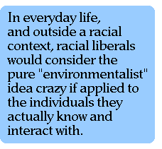 Now to the main event, intelligence. On which side of the cultural/biological frontier does it lie, and how malleable is it? [12] In discussions of race, liberals and egalitarians take intelligence to be a variable purely of one's cultural environment. But in everyday life, and outside a racial context, they would consider the pure "environmentalist" idea crazy if applied to the individuals they actually know and interact with. Listen to them talk about the "interbred gene pool" and "extra chromosomes" of the group toward whom they feel free to act as racists: white hillbillies. Appalachians aside, liberals also admit (with much greater sympathy) the genuineness of biologically based mental retardation. If they were willing to confront modern investigations of the subject, they would discover that scientists such as Rushton have established a high correlation between average intelligence and a wide range of unquestionably inherited traits, clustered by race. [13] They would also discover, in the results of twin studies, that while extraordinary environmental interventions the adoption and raising of Negro children by wealthy, highly educated white parents can produce a modest rise in IQ above the control level, such improvements are only temporary.