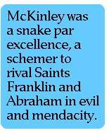 And, of course, the bland, innocuous Republican William McKinley became president. Except that, says Karp, he wasn't innocuous. Karp backs up that contention with sufficient documentation to convince your humble reviewer that McKinley was a snake par excellence, a schemer to rival Saints Franklin and Abraham in evil and mendacity.