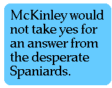 The Spanish government, with its threadbare army and pathetic navy, tried to avoid war every way it could. But every concession was met with new American demands and new allegations of treachery and brutality. The Maine's mysterious explosion was only the icing on the cake for McKinley, who would not take yes for an answer from the desperate Spaniards. Years later, it was determined that the explosion came from inside the ship, not from electrically controlled mines deliberately set off by the Spanish, as alleged by the warmongers. Whatever the real cause, it provided a convenient backdrop to McKinley's message to Congress asking for a declaration of war. The president lied through his teeth, saying that diplomatic efforts to solve the manufactured crisis had been in vain, when in fact Spain had bent over backward to make concessions. And so Americans marched off to an easy triumph over a corrupt, decrepit European empire.