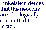 Finkelstein's idea that neocons "watch over" American imperial interests makes one wonder why the many other establishment foreign-policy elements mentioned earlier in this essay were cool or opposed to the war on Iraq. Exactly who makes up the nebulous power elite that really determines the American imperial interest and to which the neocons report? If the neocons are responsible for watching over U.S. interests we may wonder why other parts of the neocon World War IV agenda for the Middle East war on Iran and destabilization of Saudi Arabia have not yet been adopted and why the neocons have often criticized actual U.S. foreign policy, especially during the Carter, Bush I, and Clinton administrations. What does this have to say for the actual foreign policy of those administrations? If the neocons "watch over" American imperial interests does that mean that those administrations did not pursue American imperial interests? But that would be impossible given Finkelstein's belief that the U.S. government always pursues those imperial interests. Finkelstein turns Occam's razor into a pretzel. A much simpler conclusion to draw is that the neocons' policy agenda differed from that of other dominant foreign-policy elites but that various factors, especially the trauma of 9/11, enabled their agenda to gain dominance, at least temporarily.