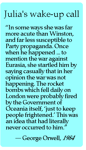 It is difficult to compartmentalize moral numbness, and mine infected more than just my understanding of World War II. After 1945, Western propaganda ministries abruptly dropped their loving descriptions of Stalin as the kindly, brave, pipe-smoking "Uncle Joe" and transformed the Soviet people from "our glorious, fraternal, democratic allies" into our most fearsome, loathsome enemy. It was an act of massive rectification that no doubt served as the principal inspiration for George Orwell's parables in 1984, where the dread enemy might change in mid-speech from Eurasia to Eastasia, whereupon the people of Oceania were obliged instantly to adopt the belief that "Oceania is at war with Eastasia.... Oceania has always been at war with Eastasia."